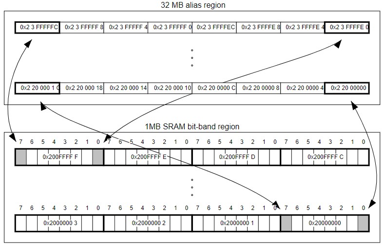 而一大串的((addr & 0xF0000000)+0x2000000+((addr &0xFFFFF)<<5)+(bitnum<<2))主要是為了能正確存取Bit-banding功能方面的alias region的位址,這邊先針對Bit-banding功能機制作些說明。