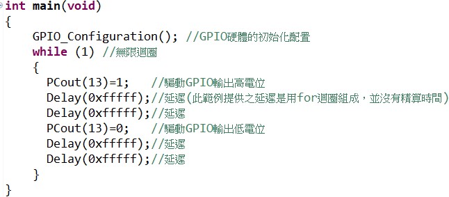 所以綜上所述,如果有仔細理解上述內容的讀者應該可以得知為何我們在main function之中去寫PCout(13)=1就得以直接驅動GPIO輸出high level(邏輯1)的數位訊號。因為在上述巨集的實作方面,就已經讓PCout(13)=1直接對應存取到GPIO之對應暫存器的內容值